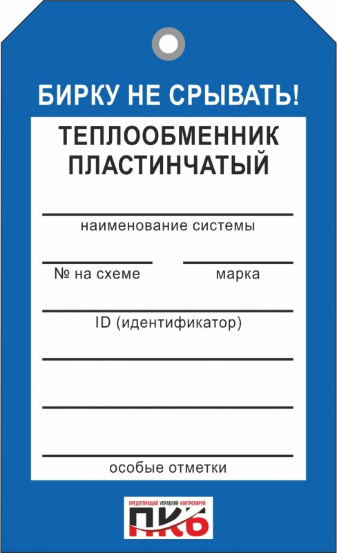 Информационная бирка "Теплообменник пластинчатый". Изготовлена из пластика ПВХ, толщиной 0,3 мм, без ламинации, диаметр отверстия 7 мм. По желанию заказчика толщина бирки может быть увеличена до 1-2 мм. Нанесение текста необходимо производить маркером или шариковой ручкой. Размер 70 х 115 х 0,3 мм.